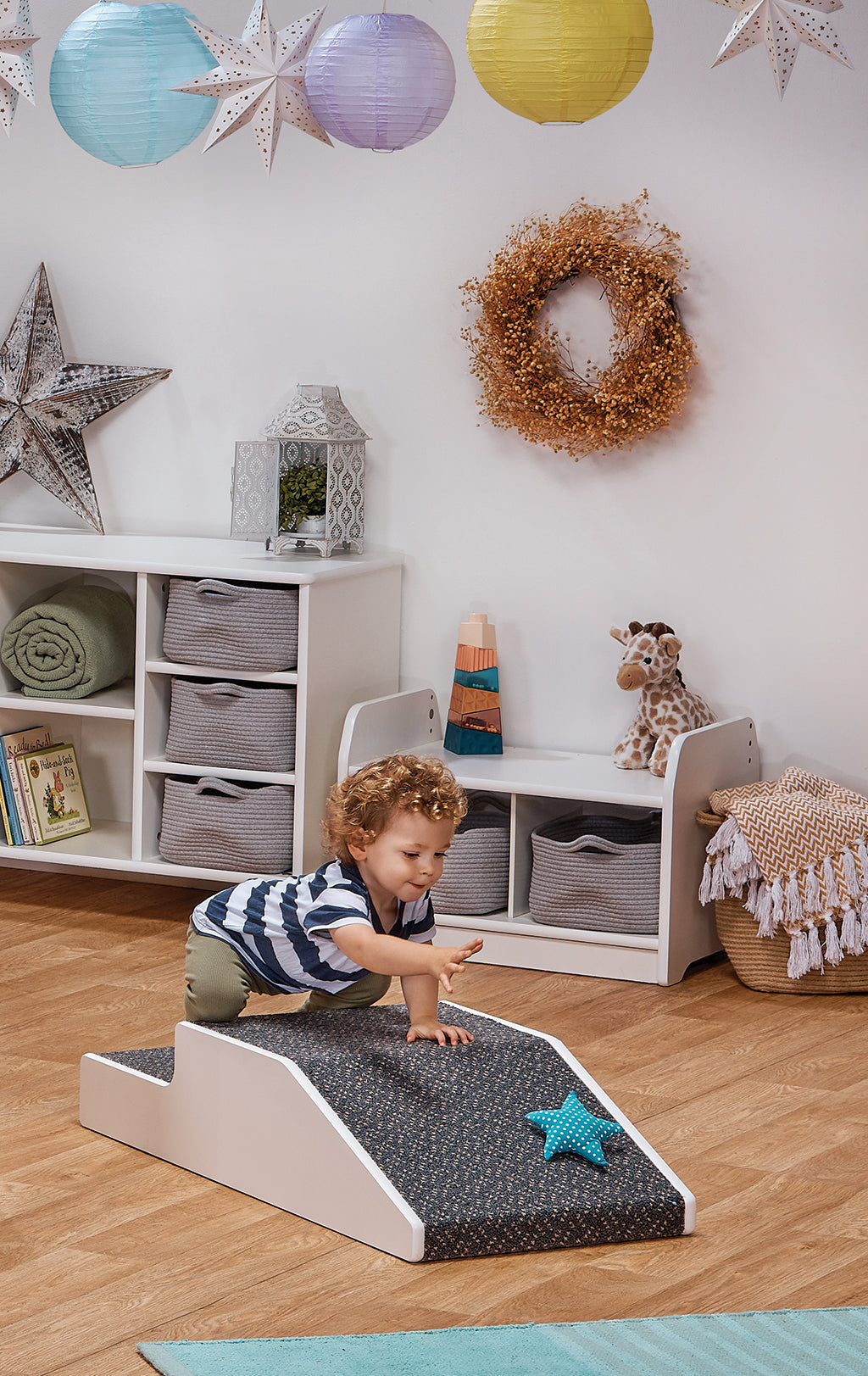 White Step N Crawl is specially designed for children aged 12 months+ to encourage discovery, strengthen coordination and support agility. The heavy-duty carpet provides a tactile surface for babies to crawl on.