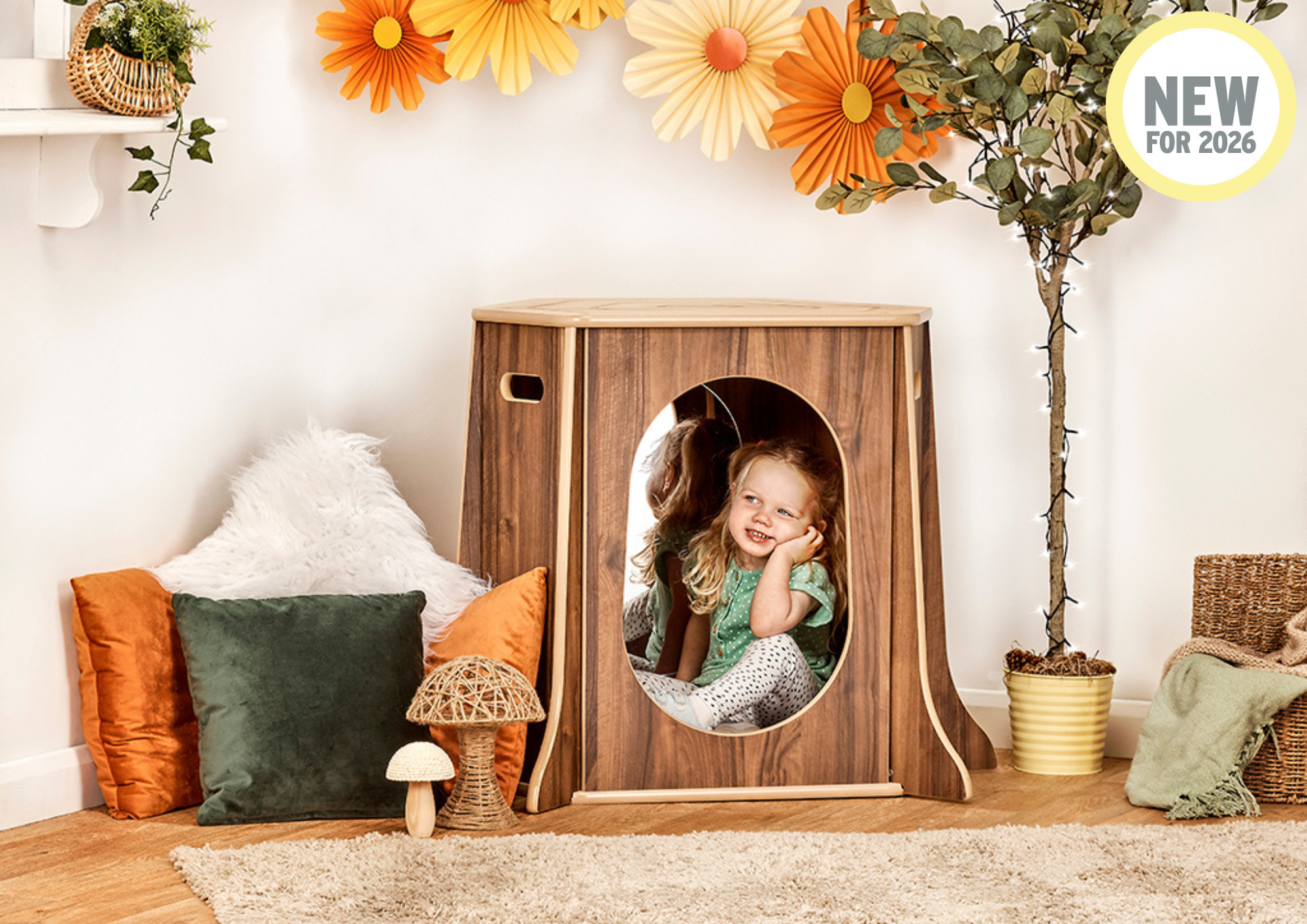 The sturdy, walnut-coloured panels create the look of a hollow tree, bringing a warm, natural aesthetic to the environment, whilst its hexagonal shape and smooth, rounded edges make it perfect for corner placement.