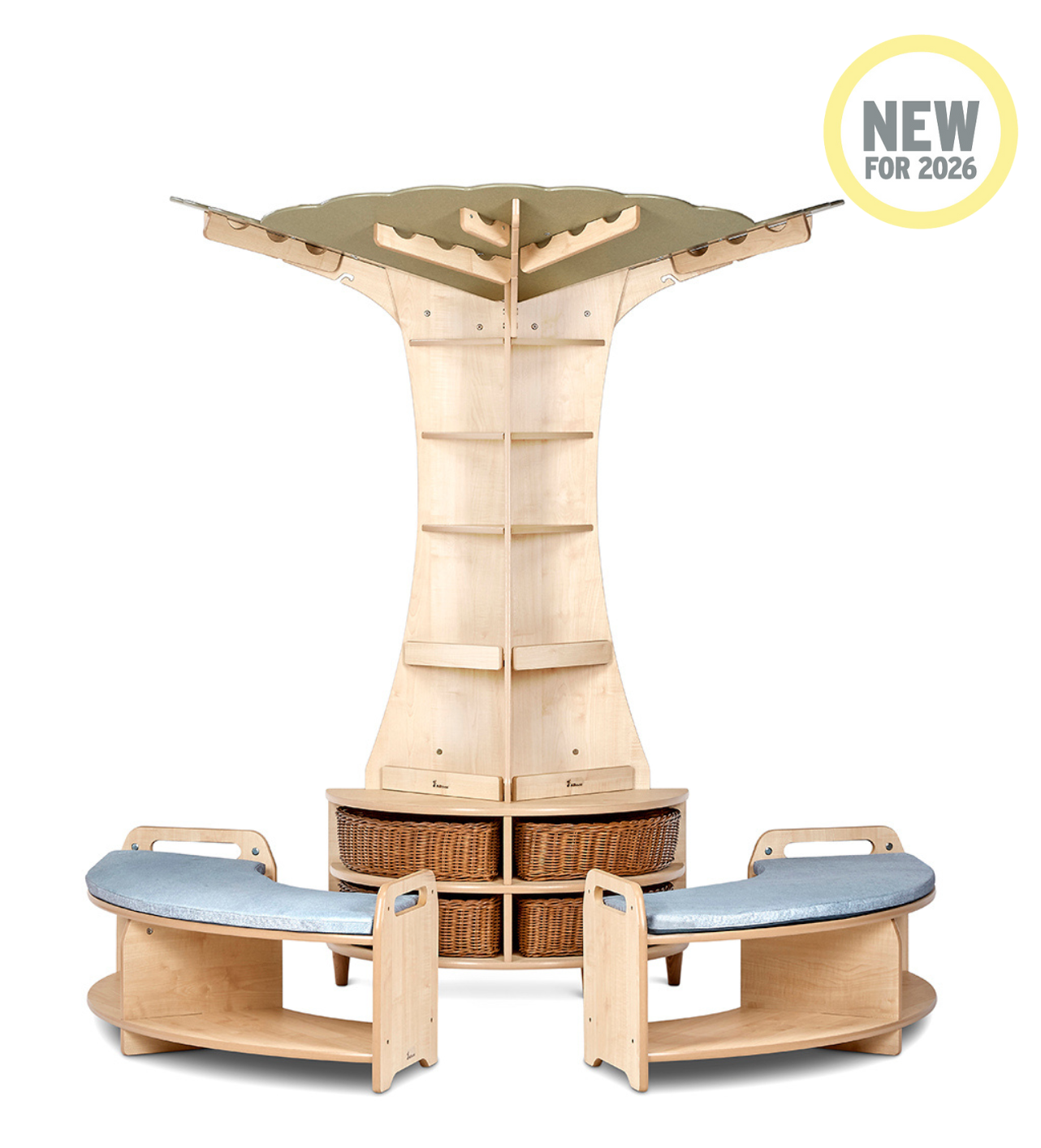 The circular maple base provides a practical finishing touch, with four corner storage baskets to keep resources tidy and accessible. For added comfort and flexibility, the Wall-Mounted Storytelling Tree Set is supplied with two Low Open Sweep Benches. NB: Overall height is 2200mm, standard ceiling height is 2400mm.