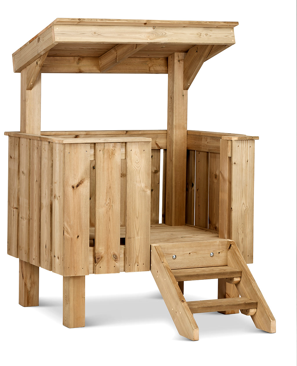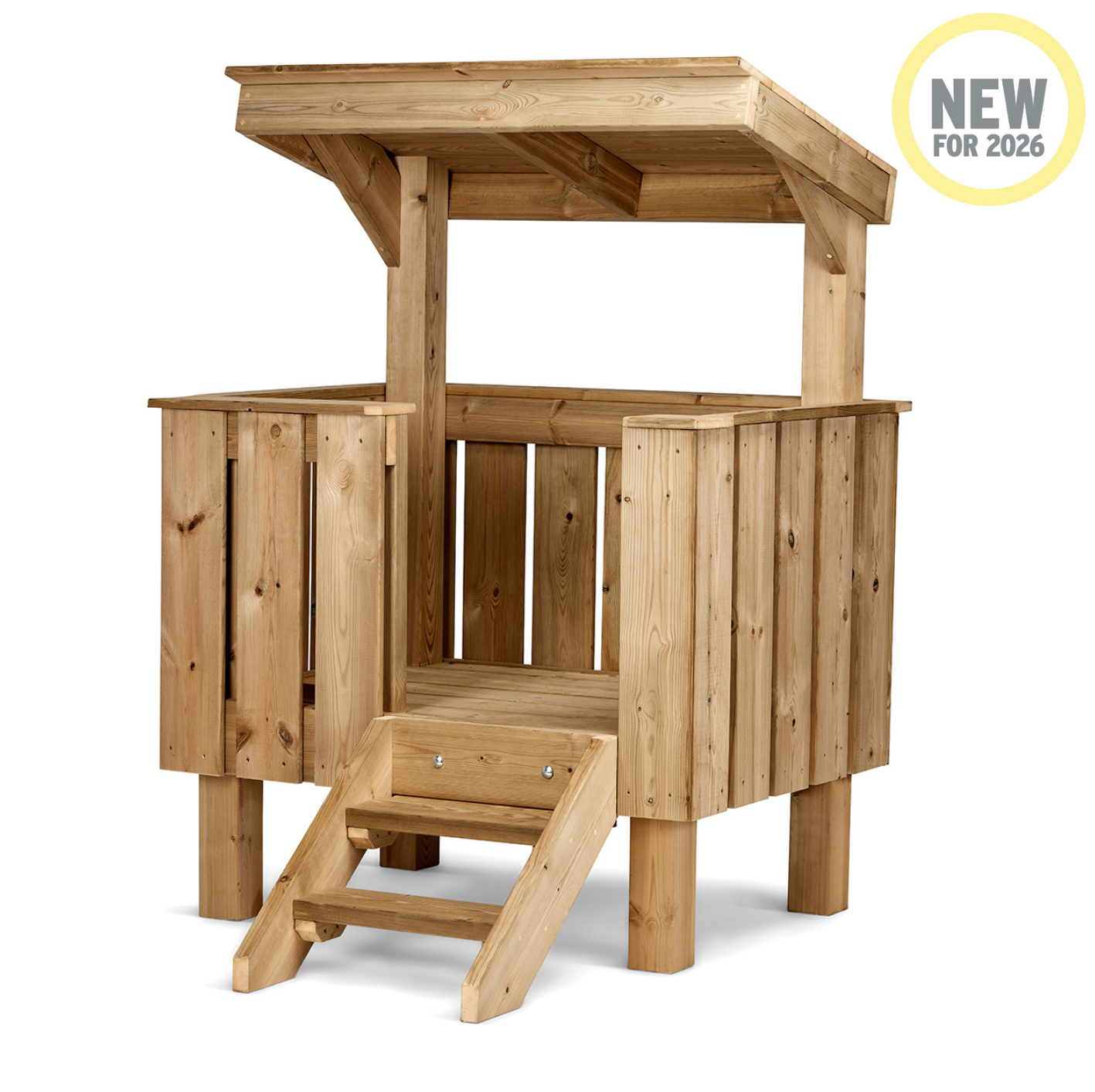 The elevated platform adds a sense of adventure and independence, while the easy-access steps and sheltered roof make it a cosy retreat come rain or shine.