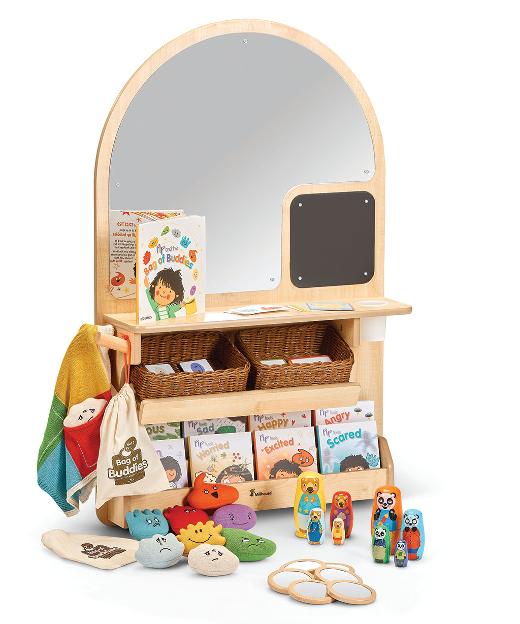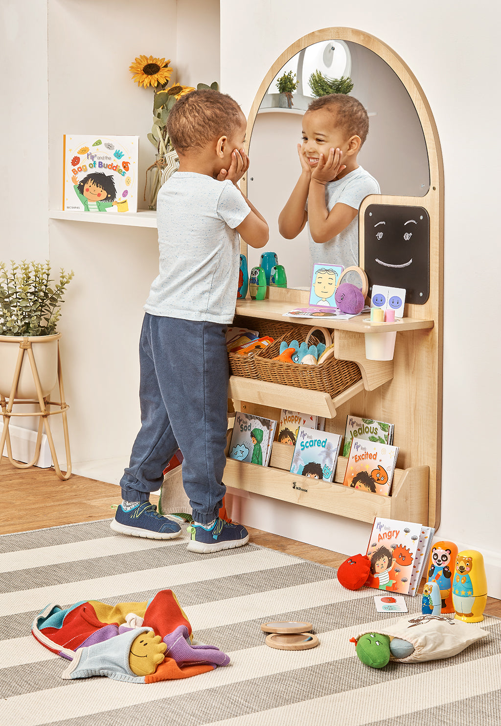 All Emotion Stations have a large integral mirror to reflect expressions, and a chalk board insert that can be used by practitioners and children, to support and extend learning. Each station features baskets and shelving to allow children to self-serve, and resources can be efficiently stored when not in use.