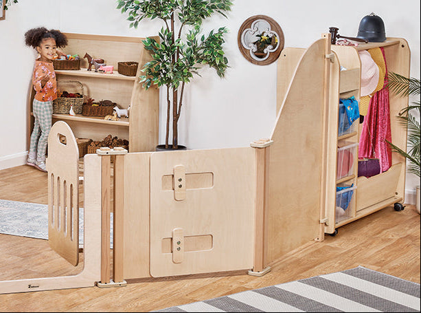 Toddler panels are great for dividing space, creating activity areas and cosy quiet enclosures. Lockable joining blocks allow panels to join securely to each other at seven different angles, enabling you to create any shape to meet your needs and make the most of the available space. Made from solid beech timber and birch plywood with a tough child-safe, clear lacquer finish. Panels can be connected to Millhouse furniture units, or a wall, using the Millhouse Furniture Panel Connector. A minimum of three panels are required for freestanding configurations.